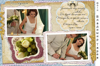 Мы с мужем занимаемся свадебным фото и для заказчиков я делаю вот такие коллажи в стиле dijital scrap. Вот и первая пара, коллажи довольно сдержанные по цветам и обилию украшений, так как задача стояла - чем проще - тем лучше. Вот что получилось.